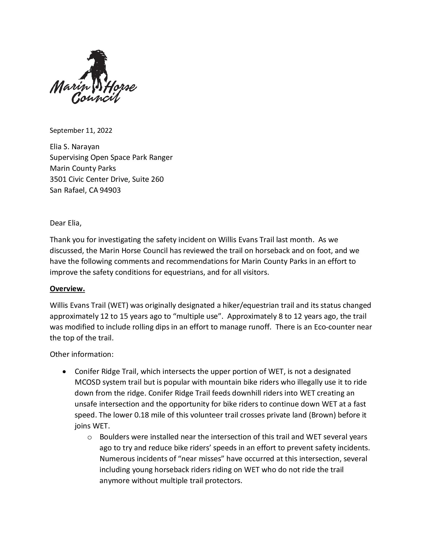 MHC Is reaching out to Marin County Parks to ask for a seat at the table for San Geronimo Commons’ planning. IN PROGRESS